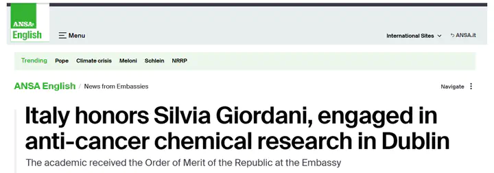 ANSA English: Italy honors Silvia Giordani, engaged in anti-cancer chemical research in Dublin